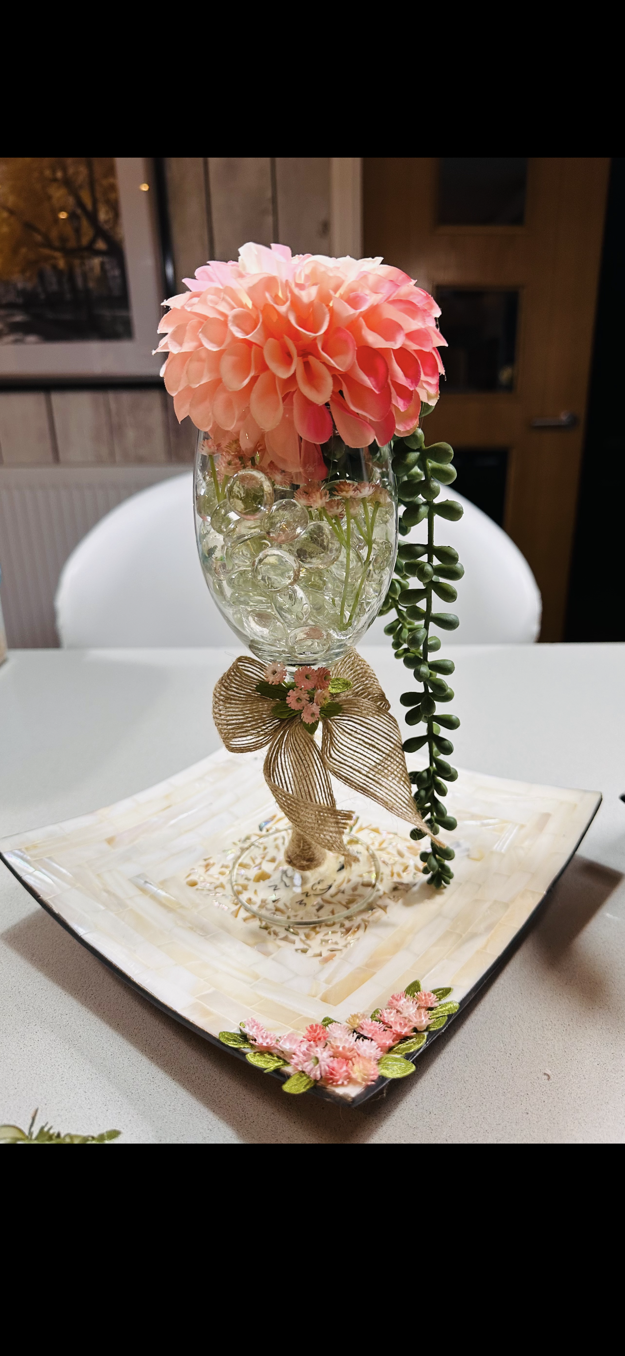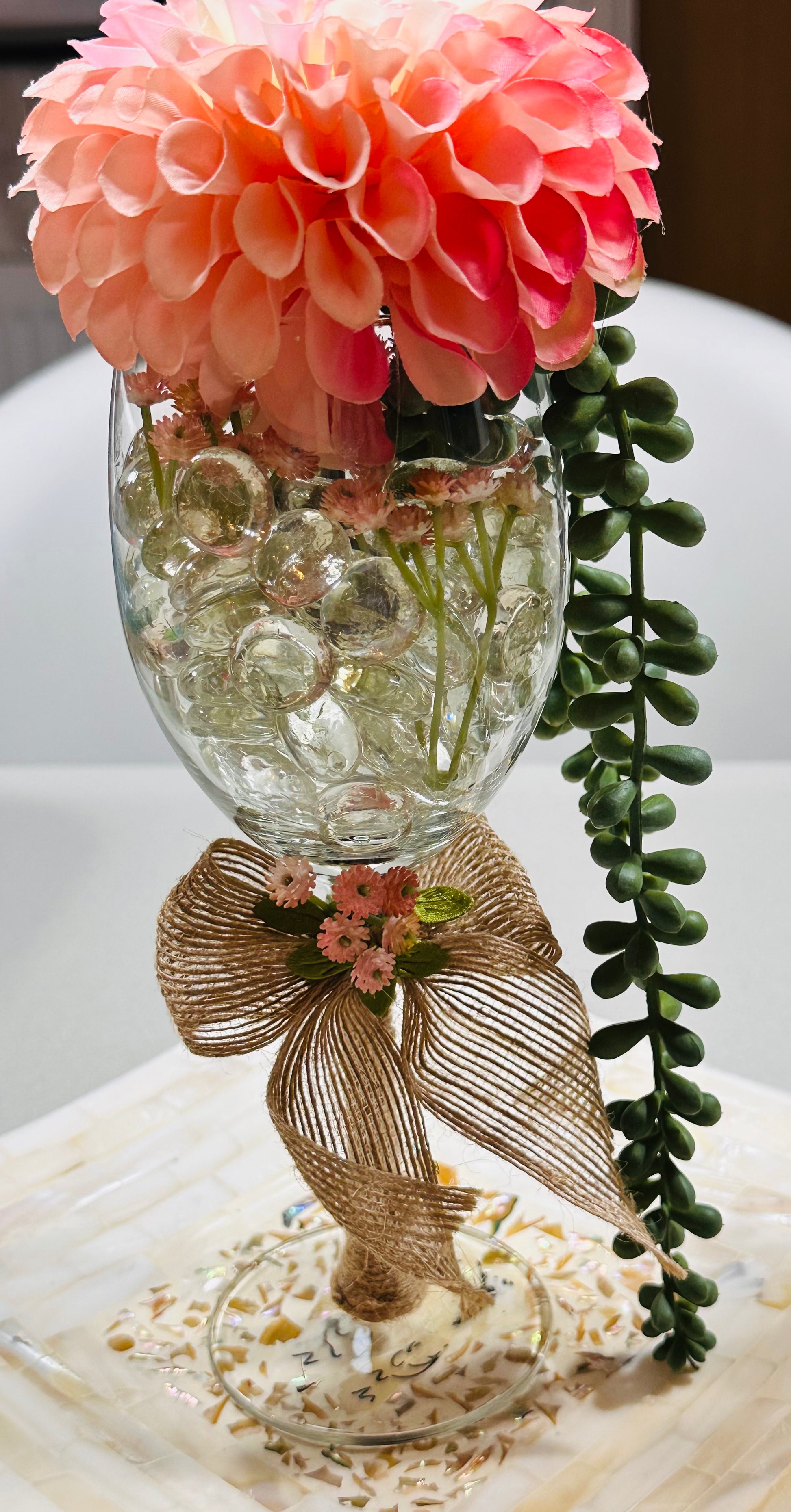 Add a touch of timeless elegance to your celebration with our exclusive wedding keepsake โ€“ a delicate wine glass adorned with a beautifully crafted flower, sparkling glass bead dรฉcor, and tiny accent blooms.